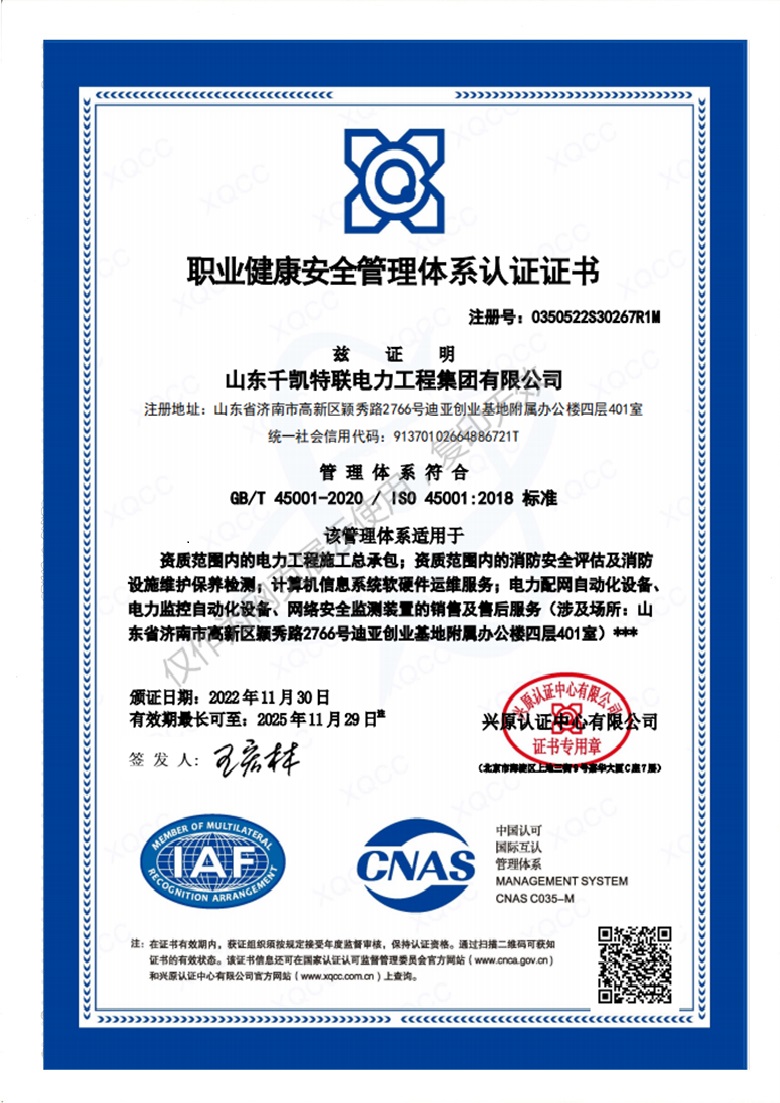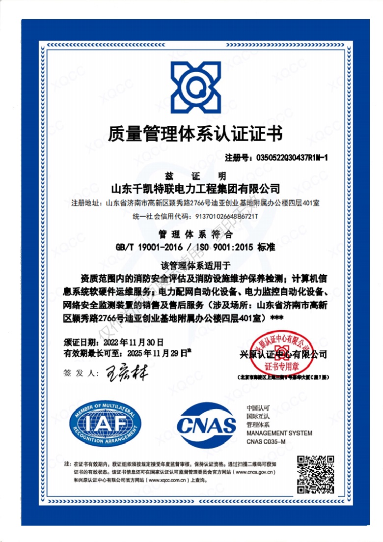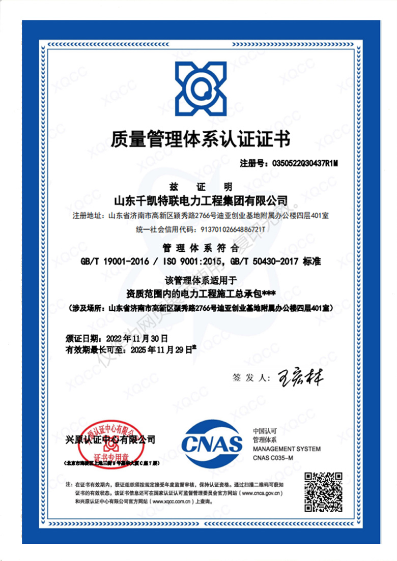 ISO9001質(zhì)量管理體系證書(電力施工)