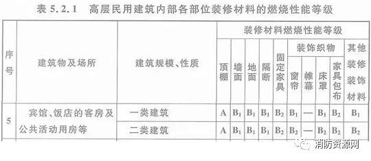 二、高層旅館建筑內(nèi)部各部位裝修材料的燃燒性能等級,不應低于《建筑內(nèi)部裝修設計防火規(guī)范》5.2.1規(guī)定:
