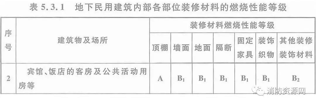 三、地下旅館建筑內(nèi)部各部位裝修材料的燃燒性能等級,不應低于《建筑內(nèi)部裝修設計防火規(guī)范》5.3.1規(guī)定: