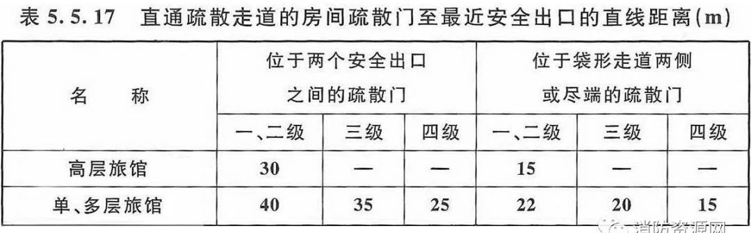 旅館建筑直通疏散走道的房間疏散門至最近安全出口的直線距離不應大于《建規(guī)》 5.5.17 規(guī)定(下表供參考,備注要求見表 5.5.17 ):