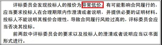發(fā)現(xiàn)投標人的報價為異常低價,有可能影響合同履行的,應當要求投標人在合理期限內作澄清或者說明,并提供必要的證明材料。不能說明其報價合理性,導致合同履行風險過高的,應當否決其投標。