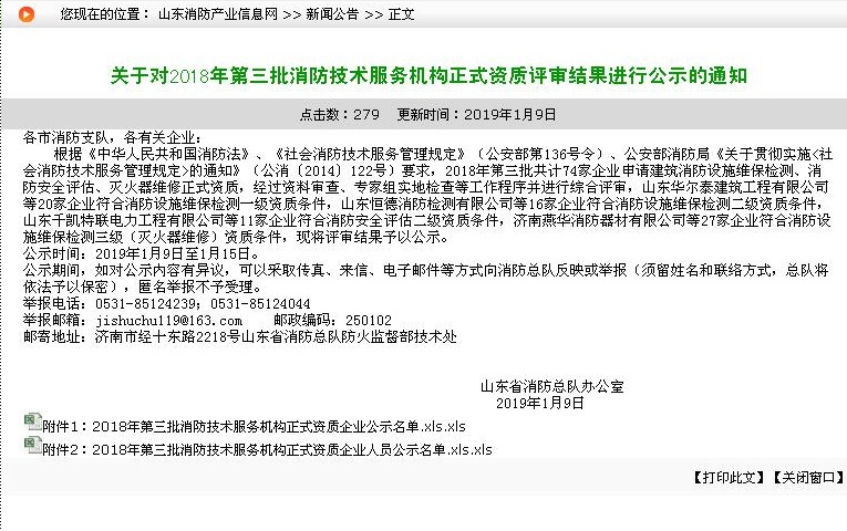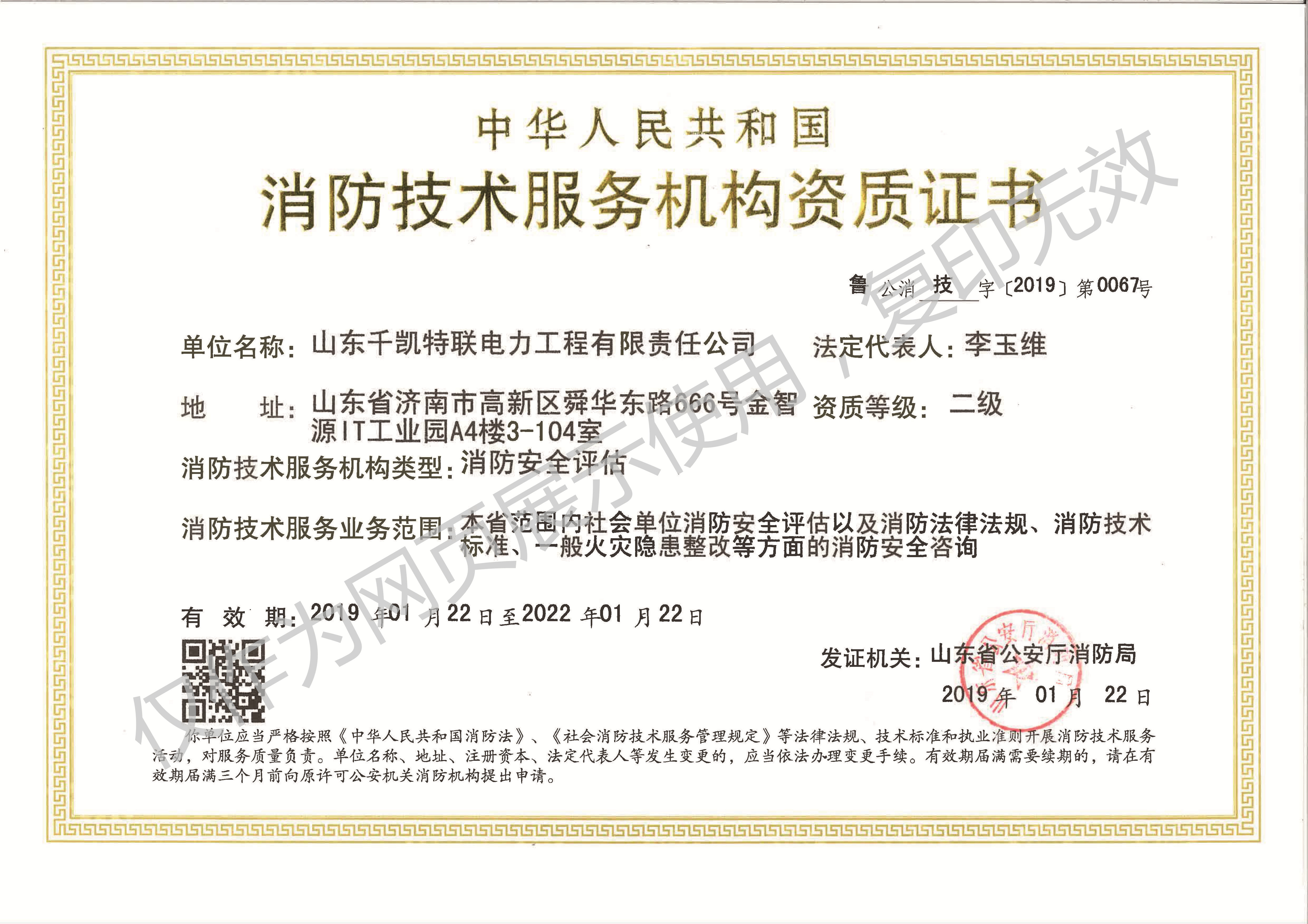 在公司領導和各部門的全力配合下,經(jīng)過材料申報、嚴格的現(xiàn)場條件審查、公安部消防局材料復核等層層考核,山東千凱特聯(lián)電力工程有限責任公司于2019年1月22日順利取得了消防技術服務機構資質(zhì)證書(消防安全評估二級資質(zhì))。此證書是由山東省公安廳消防局批準并頒發(fā),可承擔本省范圍內(nèi)社會單位消防安全評估以及消防法律法規(guī)、消防技術標準、一般火災隱患整改等方面的消防安全咨詢。